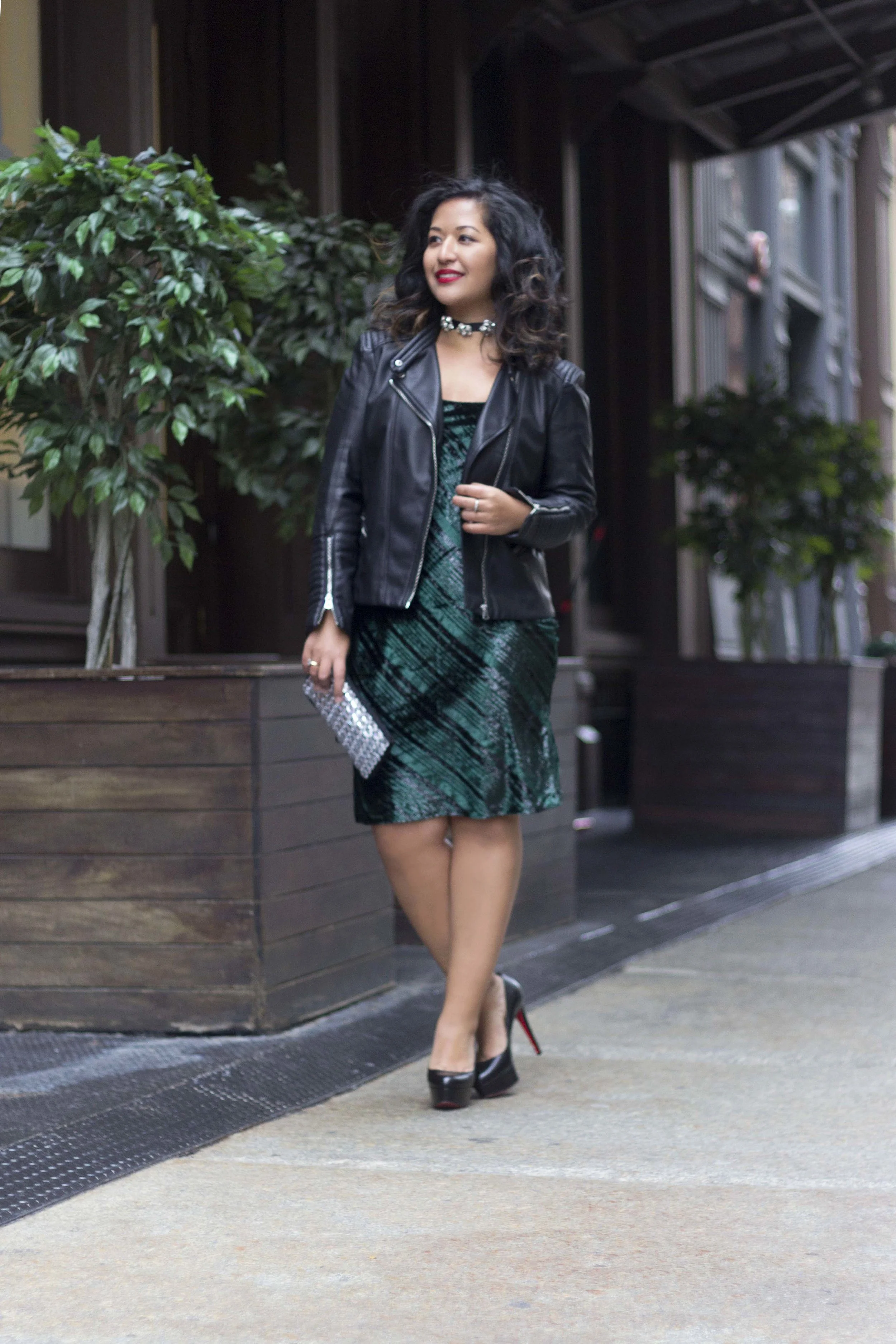 I styled this velvet slip dress with a leather jacket for a street casual look. You can wear a velvet dress with a cute cardigan for a more dressed up look, or just as is for a fancier approach. A red lip is always a good idea for the holidays too!